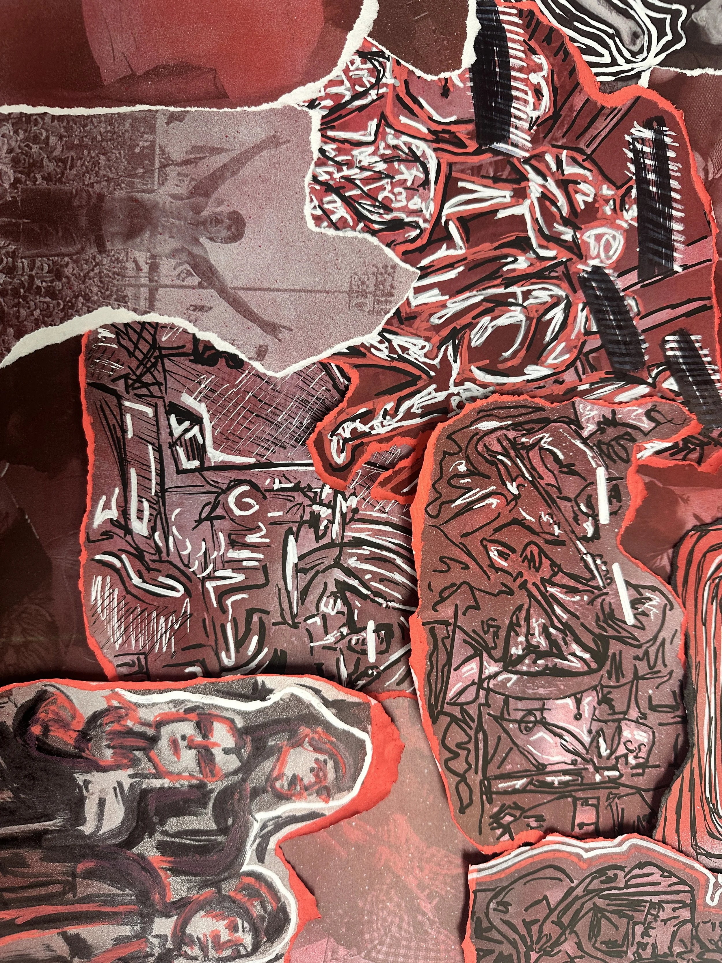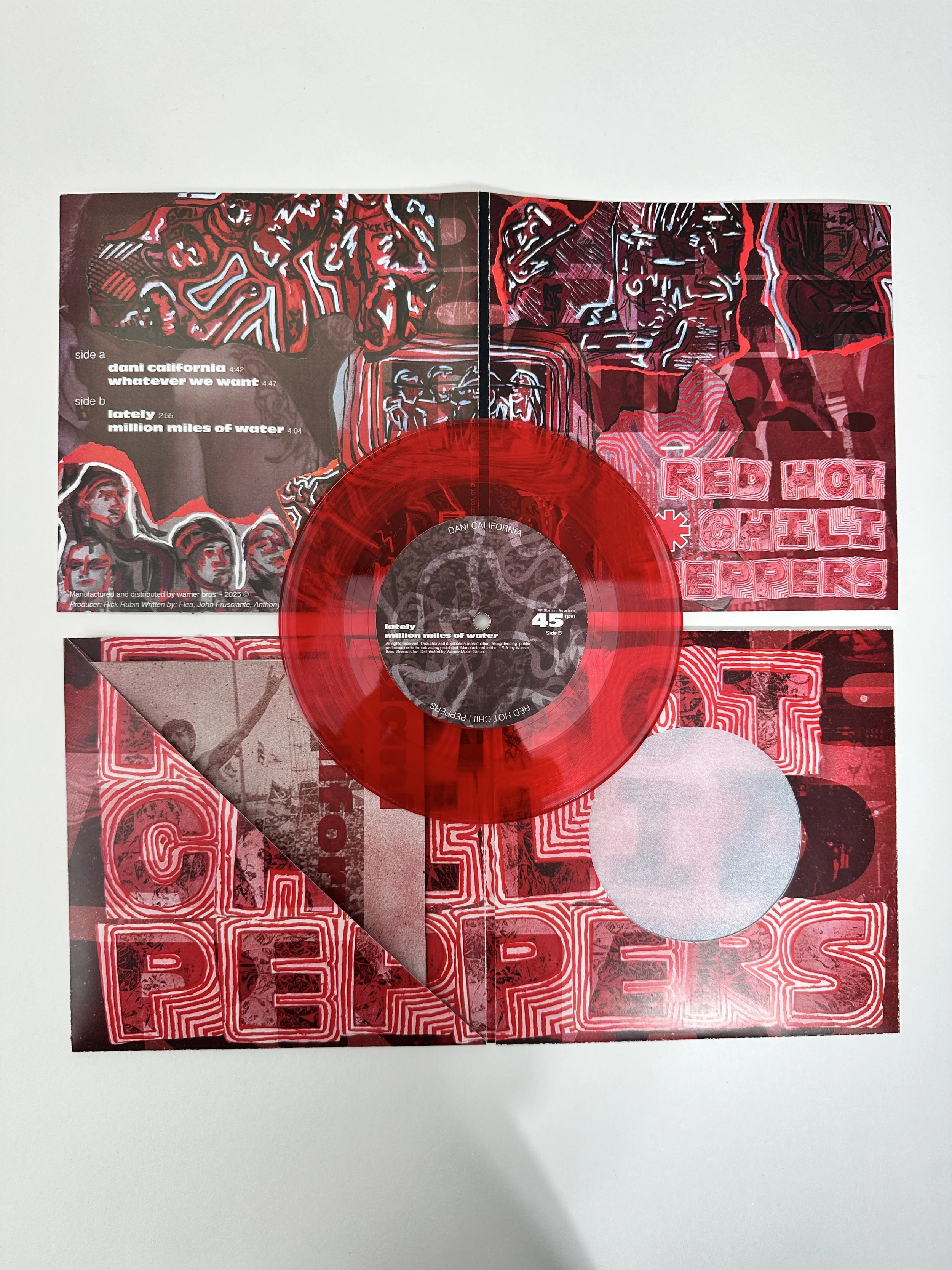 This project reimagined the Red Hot Chili Peppers’ “Dani California” EP album cover through a hands-on, fully illustrated approach. By hand-altering printed photographs using various materials like paint pens, spray paint, and ink, giving the design a raw, tactile quality that mirrors the band’s unpolished, high-energy sound. Drawing inspiration from past RHCP album covers. Emphasizing a red, black, and white color palette, expressive linework, and symbolic imagery to capture the band’s funk-rock identity.
